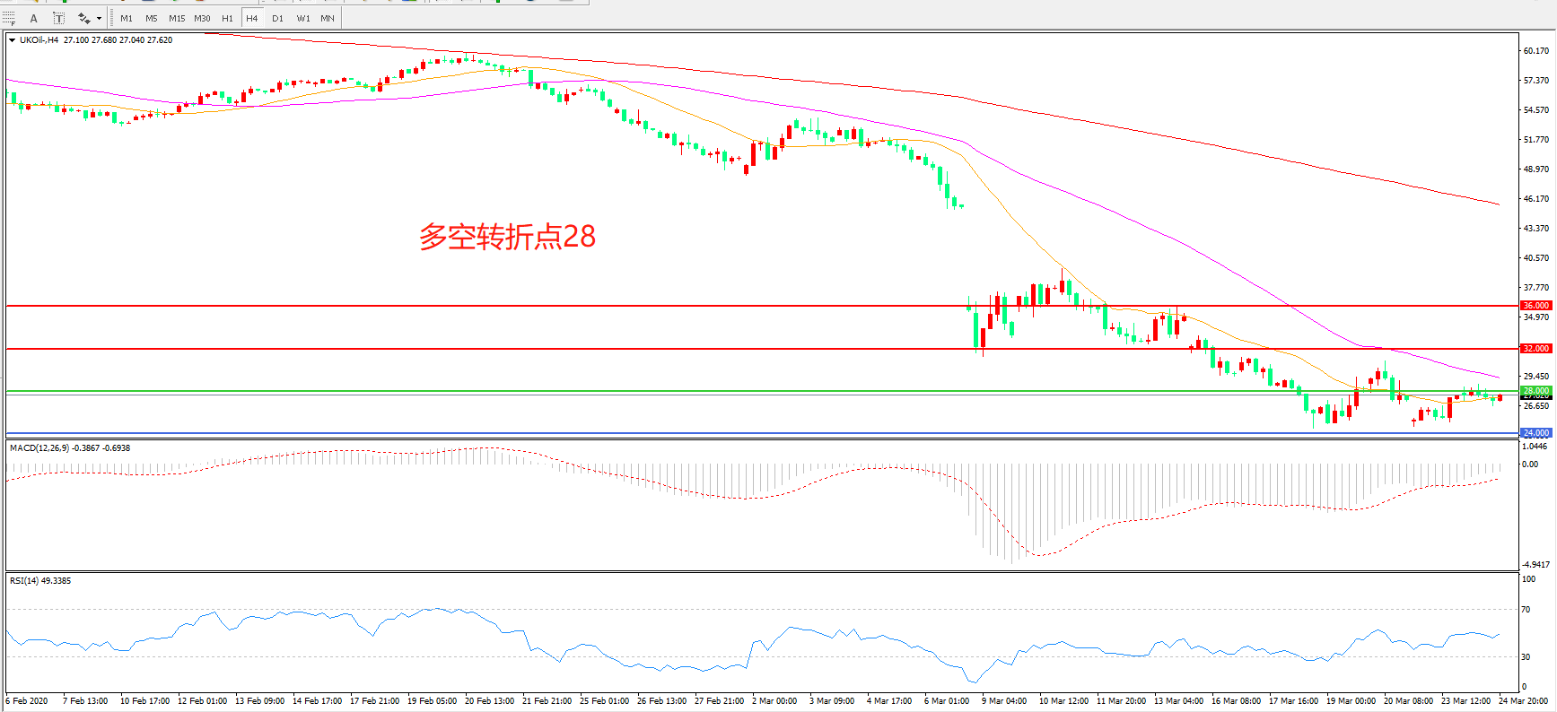 4小时图看,布油以28美元为支撑进行整理,整体出现止跌迹象,短期均线拐头,MACD绿柱减少,RSI指标走平,日内有可能出现反弹。