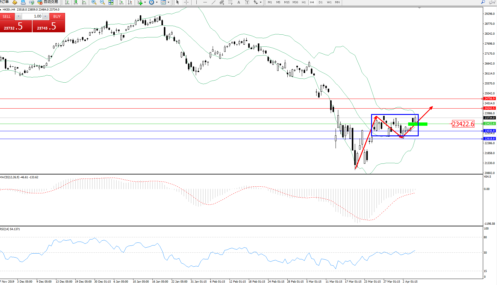 香港恒生指数4月6日(周一)收盘上涨513.01点,涨幅2.21%,报23749.12点;港股市场高开上涨,盘中主要股指皆升超2%。午后外围市场集体拉升,恒指一度大涨至2.6%。因美国新增确诊或现拐点和沙俄将达成减产协议,全球市场应声反弹十分明显。料市场短期依旧受疫情与油价的发展形势影响。主板成交量为868.14亿港元。从板块表现看,在线教育股强势领涨,香港本地地产股、武汉本地股、半导体、系统软件、手机概念股现普涨行情,影视娱乐跌幅居前,黄金股、电力股明显弱势。
