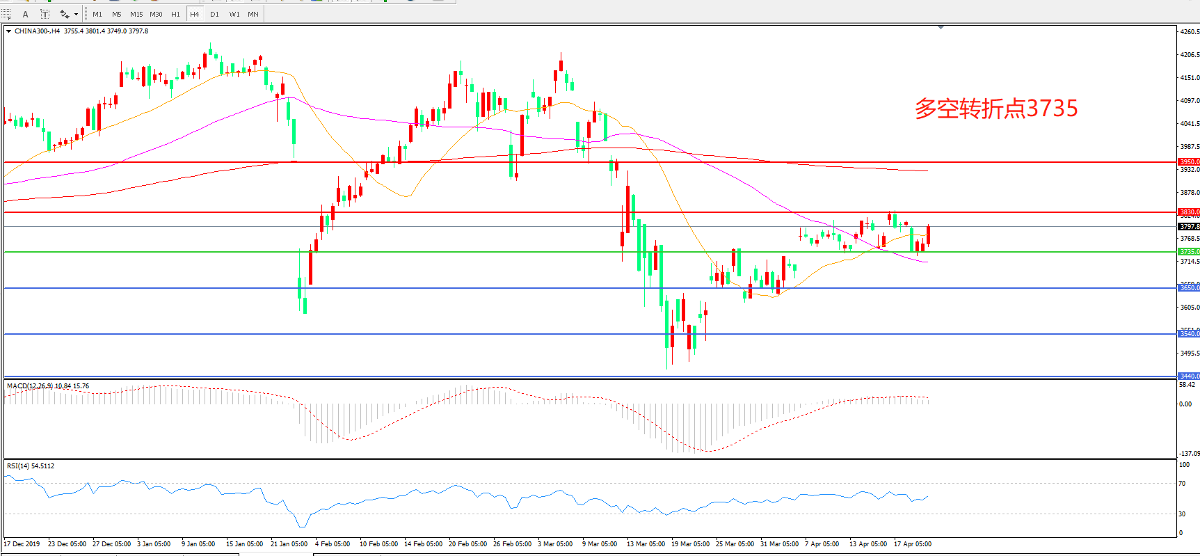 4小时图看,沪深300延续区间震荡,以光头阳线收盘,整体表现相对强势,3735成为短期多空分水岭,均线系统走平,MACD红柱增加,RSI指标向上,日内延续上行概率较大。