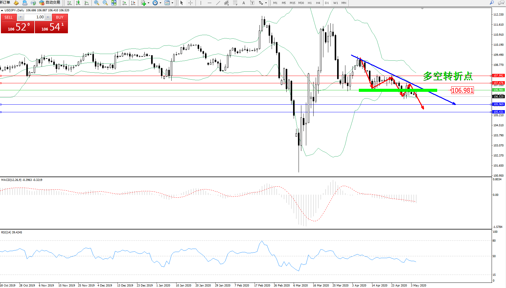 美元兑日圆重心下移,全球贸易环境紧张局势加剧,对新一轮贸易争端的担忧燃起,推动投资者寻求避险,日元连续三日走高,且此前日本政府新冠肺炎专家小组成员表示,出现了一些积极迹象,尽管检测人数增加了,但新增确诊人数却下降了,日本首相安倍晋三此前表示,把紧急状态延长至5月31日,地区性紧急框架将继续适用。