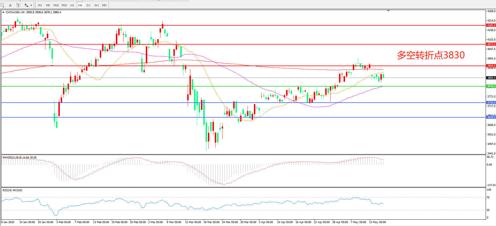 4小时图看,沪深300延续高位震荡,3830成为短期支撑, 200周期均线成为上方阻力,短期均线逐渐上穿, MACD红柱减少,RSI指标走平,日内延续震荡概率较大。