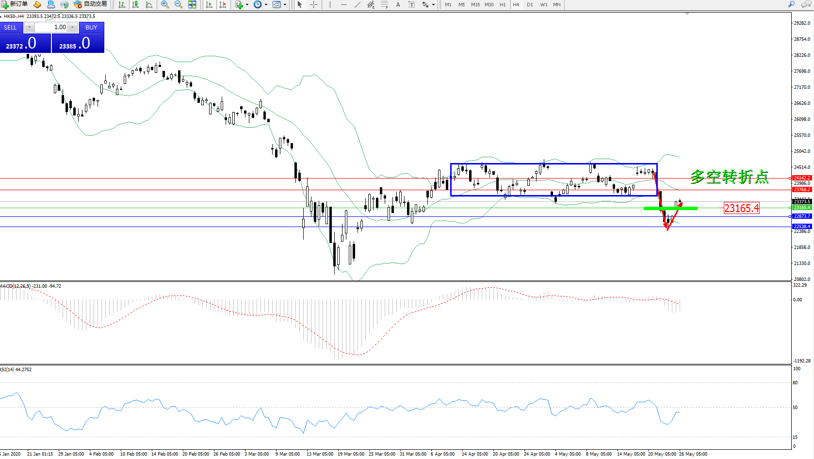 恒指HK50 ——4小时K线图显示: