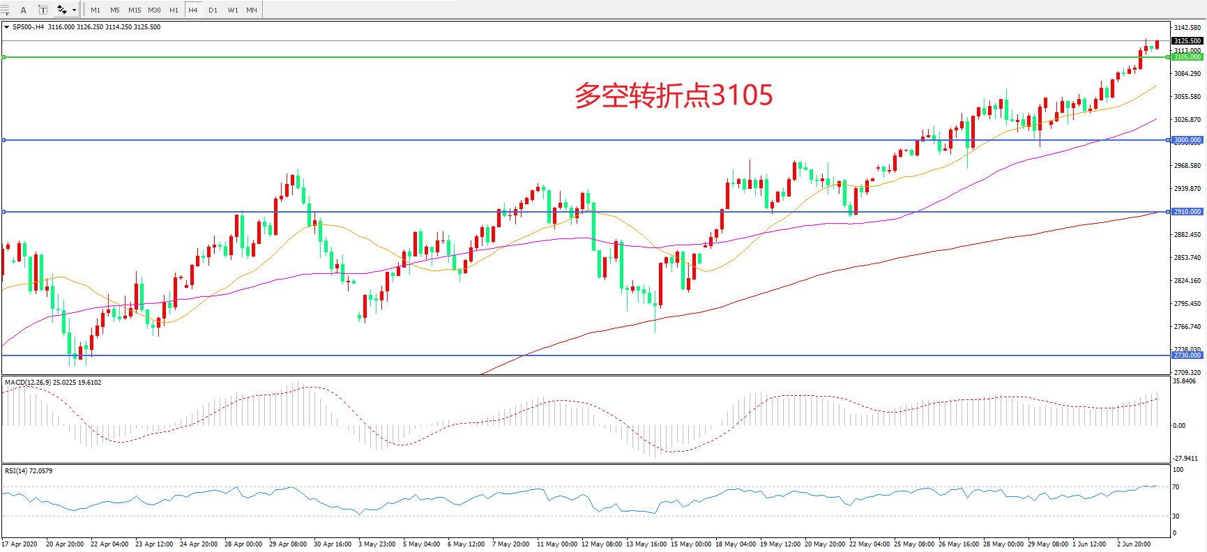 周三(6月3日),有“小非农”之称的ADP就业数据减少276万,远好于预期,为市场信心带来提振,,标普500指数大涨1.36%,报3116.50点。部分经济专家认为新冠疫情带来的萧条已经过去,标普500指数自3月23日触底以来已累计飙升36%,基本收复之前的失地。