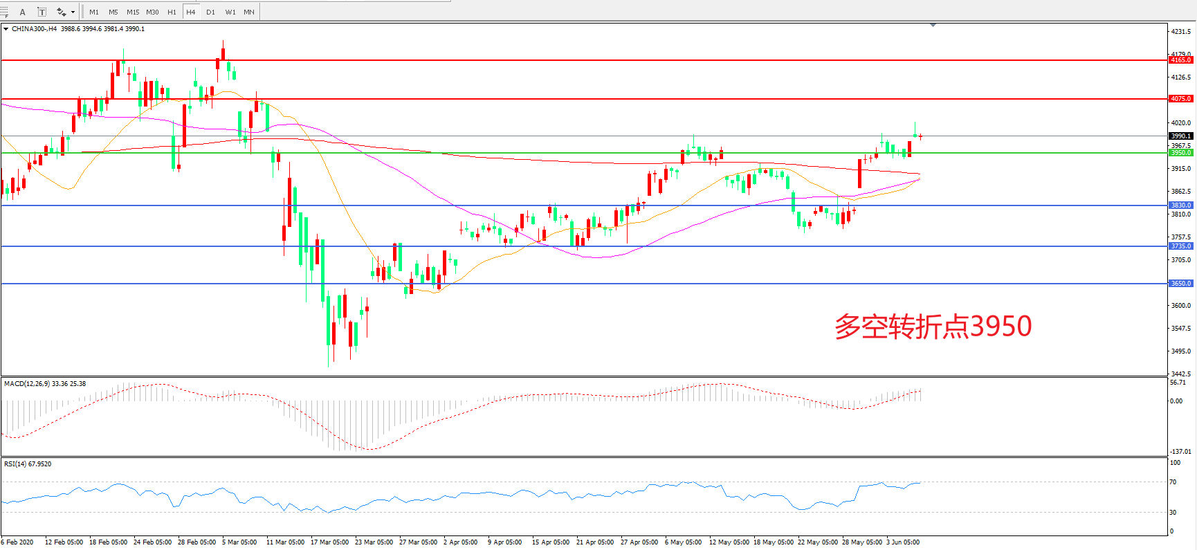 4小时图看,沪深300延续高位震荡,冲高回落后长上影先收盘,3950一线成为短期支撑,均线系统逐渐粘合,MACD红柱增加,RSI指标走平,日内延续上行概率较大。