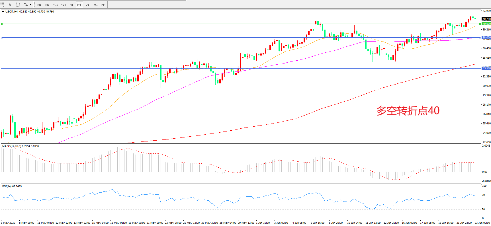 周一(6月22日),受益主要产油国供应趋紧和尼日利亚执行减产,美国WTI原油延续上行走势,小幅上涨,收报41美元/桶。从当前的情况看,油价已经进入了复苏的中期阶段,维持40美元/桶附近震荡概率较大,目前需求方面仍然到疫情的影响,进一步上行的动力稍显不足。