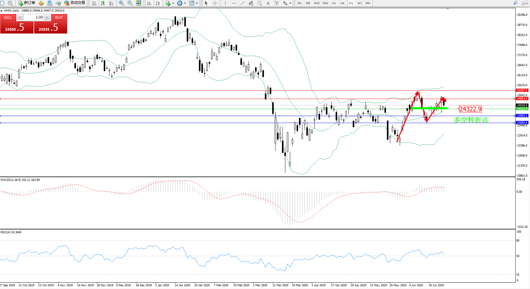 香港恒生指数6月24日(周三)收盘下跌125.76点,跌幅0.50%,报24781.58点;港股三大指数呈高开低走行情,恒指早盘曾一度收复25000点大关,临近尾盘跌幅扩大,国指跌0.57%报9936点。盘面上,生物医药B类股再次爆发,康希诺生物飙涨超15%,信达生物、康方生物均创历史新高;腾讯高开低走,收跌1.33%;有消息称黄光裕已经出狱,国美系大涨,国美零售涨超17%,国美金融科技大涨超47%。A股中关村、*ST美讯和ST金泰涨停。北京商报称国美创始人黄光裕已于近日出狱,国美官方将于近日通过公告说明具体情况,还称这一消息是在6月23日晚的国美集团高层会议中透露的。最新消息显示,北京监狱管理局表示不清楚此事;国美高层也称公司内部目前尚未通报上述消息。