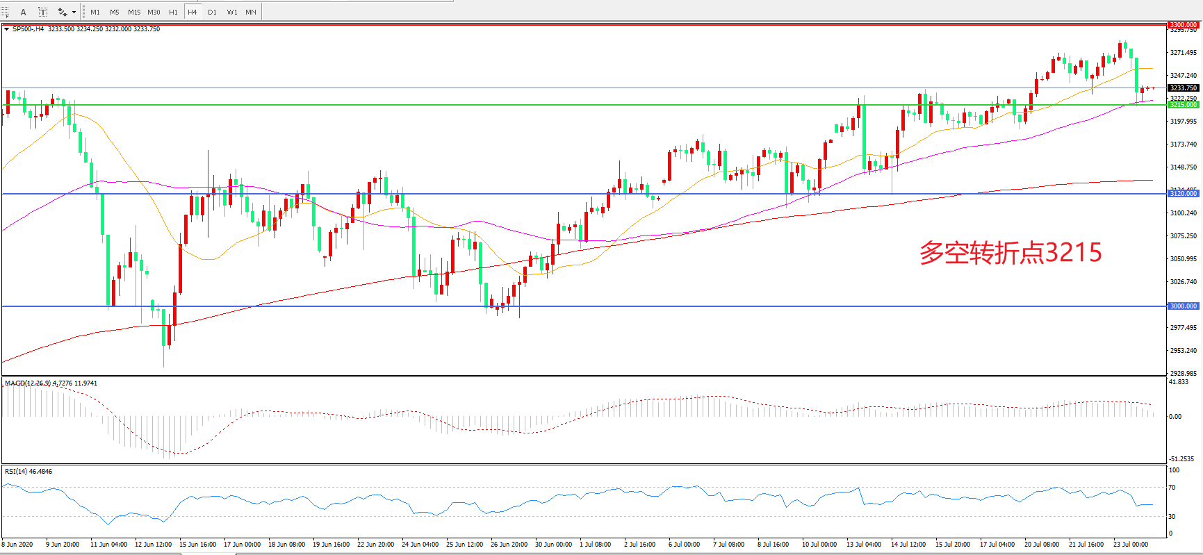 周四(7月23日),美国劳工部的数据显示,上周首次申领失业救济人数达到 141.6 万人,远高于预期。劳动力市场的低迷表现打压了美股,标普500长阴下破,收报3233点。其中大型科技股全线下跌,Facebook 跌 3.03%,亚马逊跌 3.66%,苹果跌 4.55%。