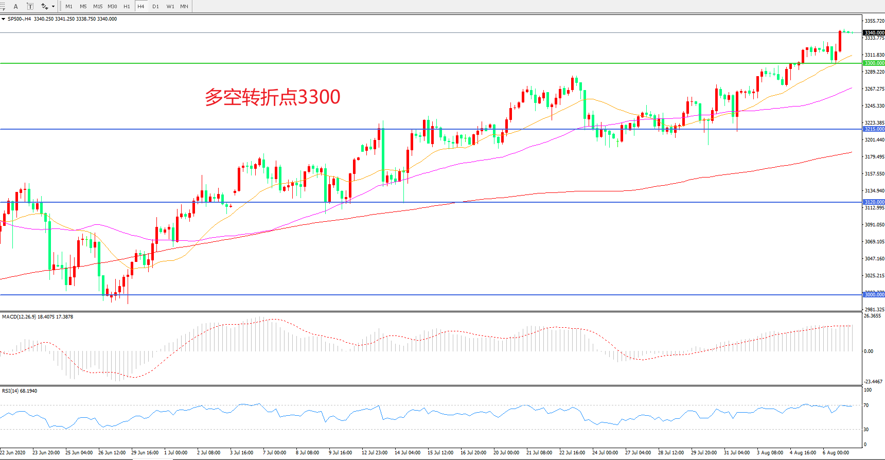 周四(8月6日),市场聚焦于财报及疫情纾困刺激方案谈判进展,同时美国上周初请失业救济人数远低于市场预期为美股带来提振,标普500大幅拉升,收报3341.50点。大型科技股继续带领整个盘面,苹果涨3.49%,亚马逊涨0.62%,奈飞涨1.39%。