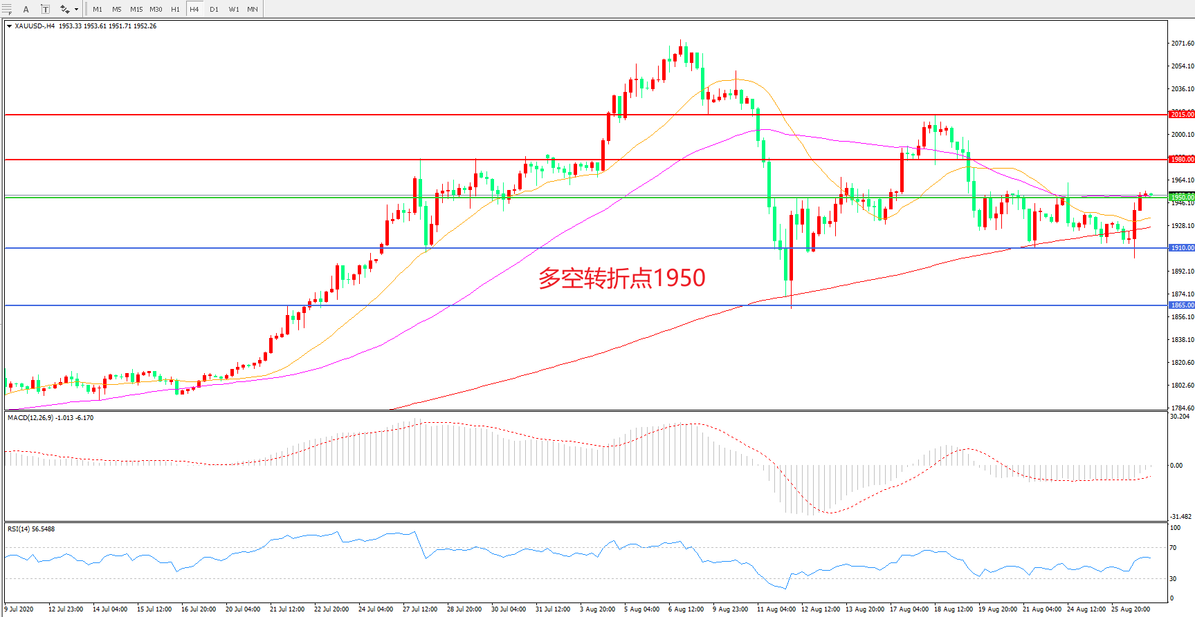 周三(8月26日),因美元指数在美联储主席鲍威尔发表讲话前夕走低,提高了黄金的吸引力,现货黄金大幅反弹,收报1951.05美元/盎司。在美联储主席鲍威尔即将发表重要讲话之前,多空双方都不敢大肆建仓,对于当前的资本市场而言,最重要的是来自美联储的旨意。