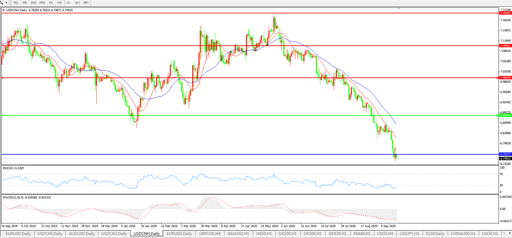 美元兑人民币USDCNH 日线图: