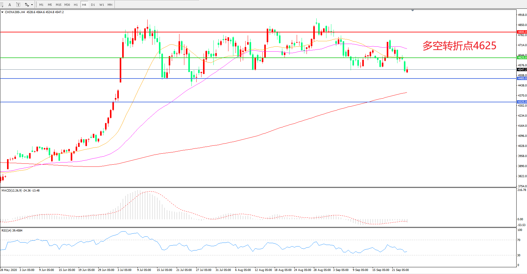 4小时图看,沪深300长阴下破,低开低走,短期走势相对低迷,4625成为上方阻力,均线系统走平, MACD绿柱增加,RSI指标向下,日内延续震荡概率较大。