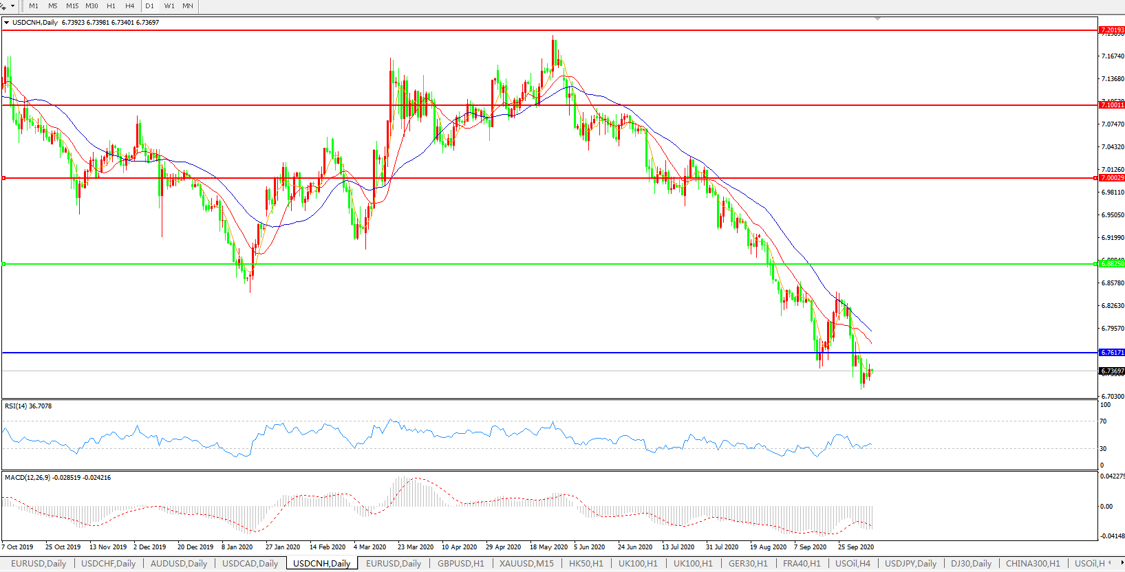 美元兑人民币USDCNH 日线图: