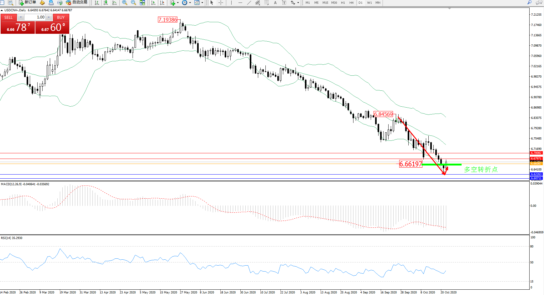 美元人民币USDCNH——日K线图显示: