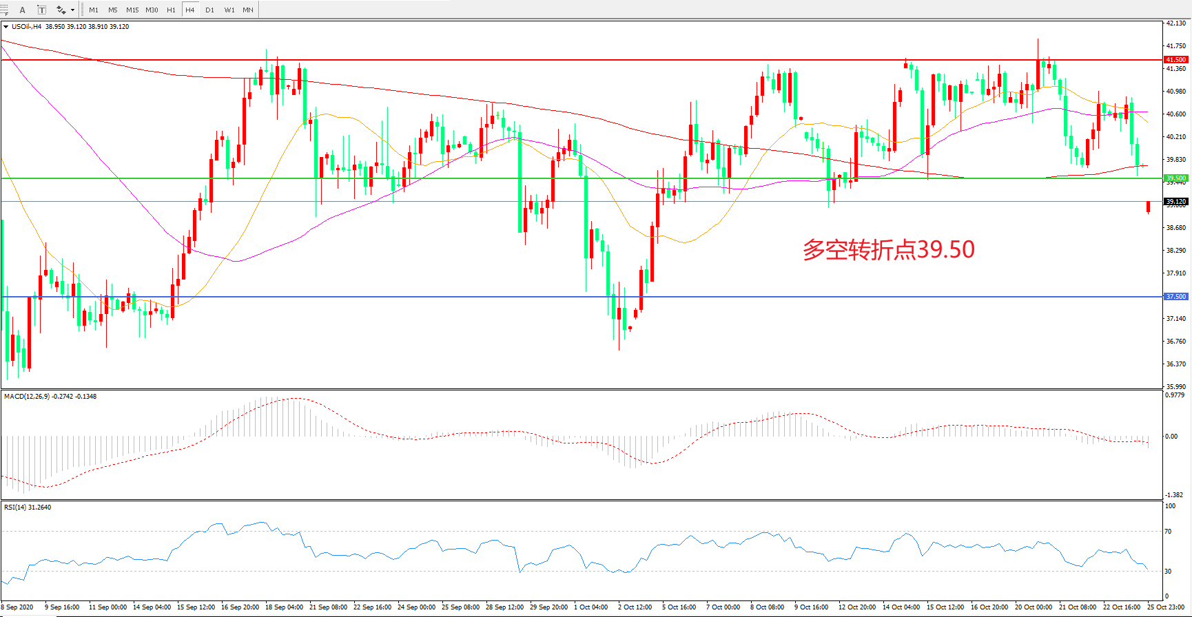 在刚刚过去的一周,美国新刺激方案的不确定性和利比亚增加出口的前景共同施压,市场对原油需求前景的担忧再度加重,美国WTI原油跌逾3%,收报39.71美元/桶。美国单日新增病例超国8万,为疫情爆发以来最高,而欧洲第二波疫情形势持续恶化冲击了未来的经济潜力及原油需求前景。 WTI原油今日开盘进一步下挫,截止发稿前跌至39.10美元/桶,创10月5日以来新低。