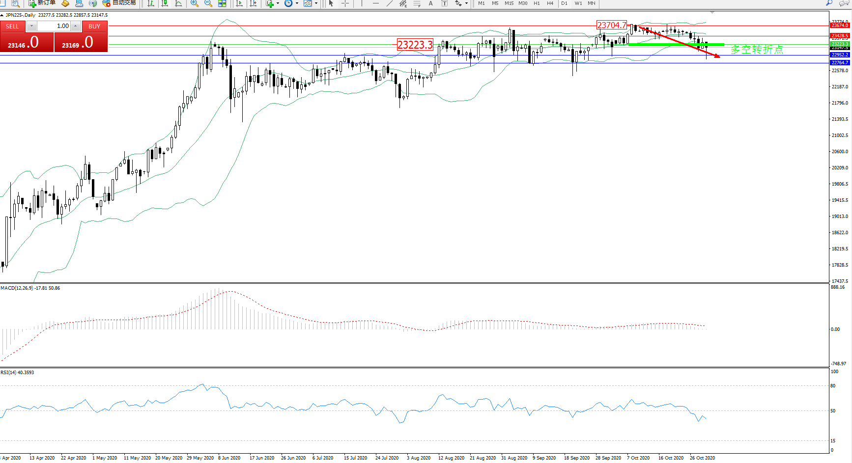 日经225指数10月30日(周五)收盘下跌322.44点,跌幅1.38%,报23009.50点。在美国三季度GDP大幅反弹,年化季率创出历史最佳的背景下,美元指数反弹,风险情绪重新偏于走低,日内日本首相菅义伟改口表示暂不考虑实施额外的预算措施,在美国大选投票日前最后的周末来袭时,市场谨慎情绪会继续升温,尤其是在欧洲市场同样遭受疫情加剧和封锁升级这样的负面消息困扰的背景下;拜登在全国和主要摇摆州领先于特朗普。在过去的几个月中,投资者越来越多地在消化拜登取胜和他所在民主党在国会两院取得胜利的可能性。根据报告,在由美国、英国和欧洲的企业、资产管理公司、对冲基金和银行组成的33名受访者中,约80%的受访者表示“他们没有,或不打算对冲,相反,他们计划等待,看看市场如何反应。”