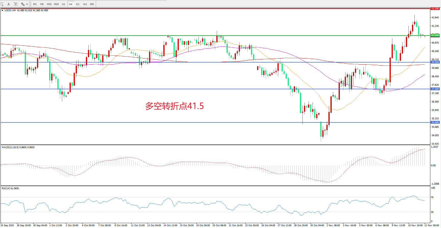4小时图看,油价出现冲高回落,短期涨势暂缓,但依然处于上行趋势之中,41.5成为多空分水岭,短期均线拐头向上,MACD红柱减少,RSI指标走平,日内延续震荡概率较大。
