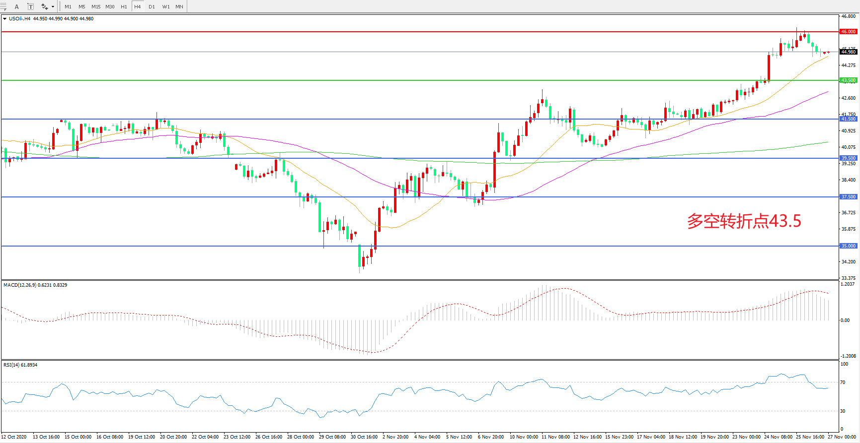 4小时图看,油价触碰46美元后小幅回落,21周期均线成为短期支撑,46美元成为中期阻力,MACD红柱减少,RSI指标走平,日内延续震荡概率较大。
