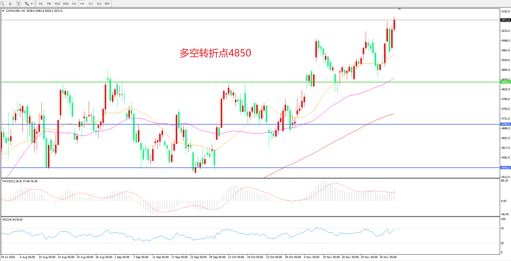 4小时图看,沪深300长阳拉升,短期走势十分强势,21周期均线成为短期支撑,5000成为上方阻力,MACD红柱增加,RSI指标向上,日内延续震荡概率较大。