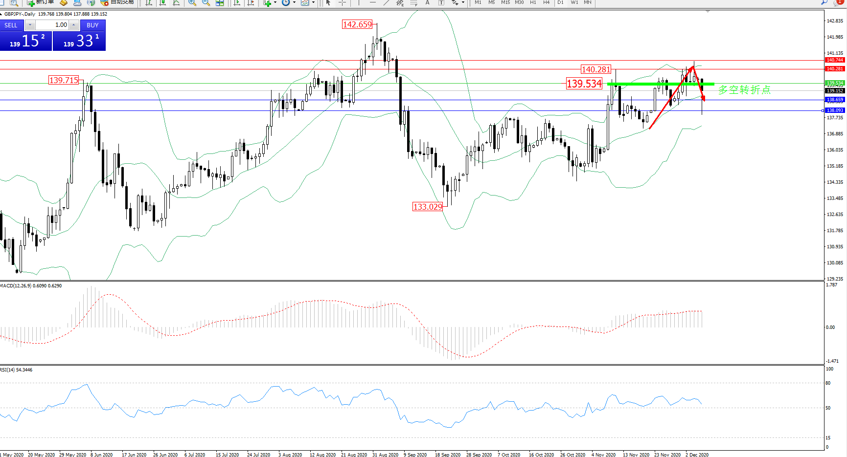 英镑兑日圆急速下挫后再度急速回升至139.152附近整理,因英镑与欧盟就脱欧问题进行的谈判再度濒临破裂,硬脱欧风险卷土重来,令市场信心全面崩塌,也令资金从欧系货币再度流出进入避险日元与美元市场。英国无协议退欧的风险上升;欧盟负责英国退欧事务谈判的首席代表巴尼尔周一在布鲁塞尔为欧盟各国特使举行的简报会上,对与英国达成新贸易协议的前景“相当悲观”。由于行情已经过度计入了英欧谈判向好的影响,因而负面消息来袭将令英镑汇价出现戏剧性的回落,而在谈判进一步受挫之后,年底之前所剩时间益发紧张的局面将在后市令投资者焦虑情绪更加升温。