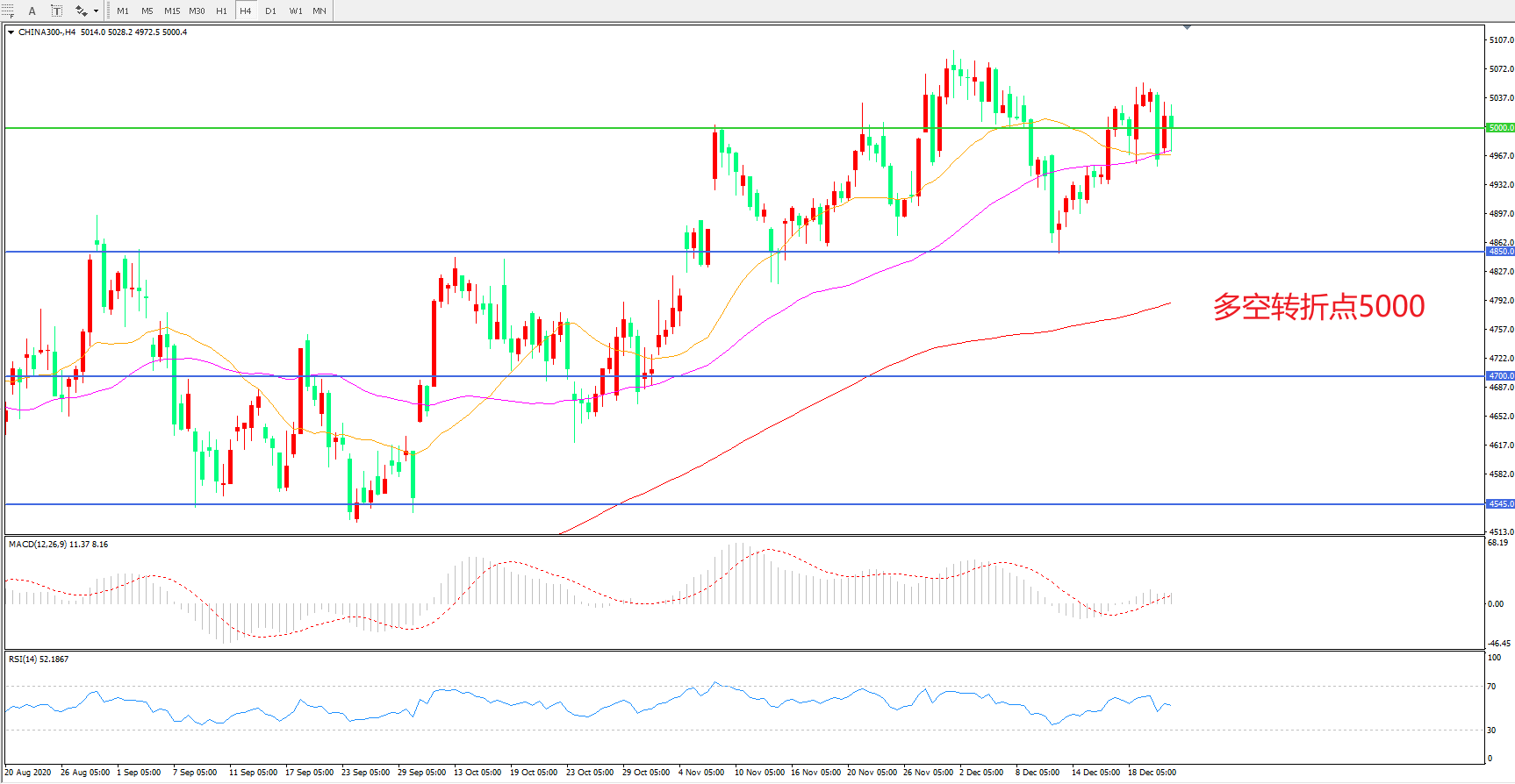 4小时图看,沪深300长阴下破后以21周期均线为依托震荡上行,短期走势回暖,5000点成为多空分水岭,MACD红柱缩短,RSI指标向下,日内延续震荡概率较大。