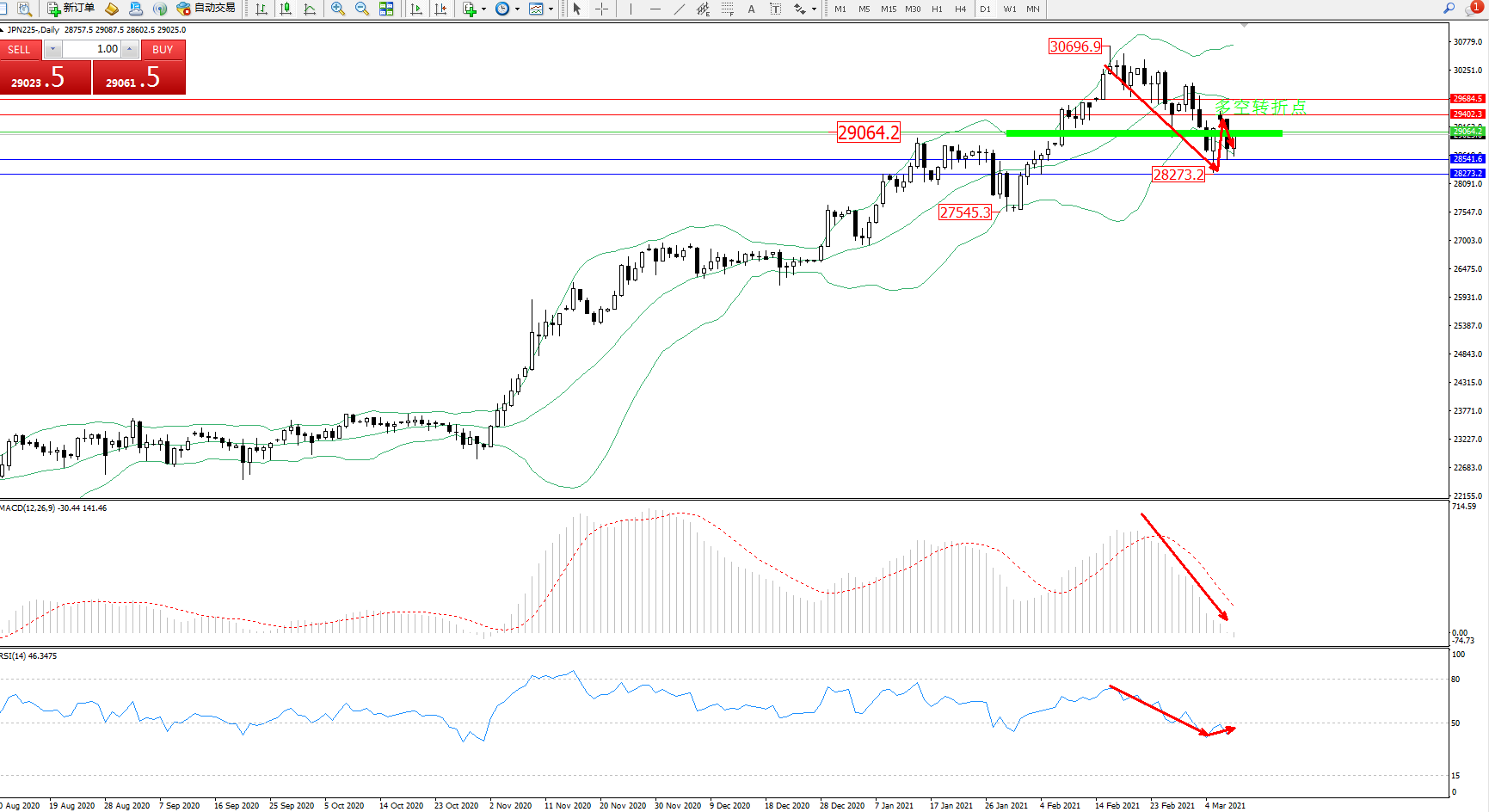 日经225指数3月9日(周二)收盘上涨280.25点,涨幅0.98%,报29023.50点。2020年第四季度日本GDP数据公布,日本经济在10-12月连续第二个季度取得增长,环比年率为增长11.7%,弱于初值12.7%,净出口对修正后GDP增长的贡献为1.1个百分点,内需的贡献是1.8个百分点,较初值贡献2.0个百分点有所下降。较于日本长期低迷的经济生态已经算是非常好的成绩,但是在疫情引发全球经济衰退,多个经济体都在复苏的大背景下,日本经济表现令金融市场大失所望,其经济依旧在恶化,企业投资和家庭支出的寒流可能会比预期持续时间更长,这预示着需求低迷,并可能使日本失去国内增长动力。所以即使日本维持了出口市场,但由于资本支出和公共支出增长放慢正在持续拖累日本经济增长,而且因为这一场疫情,日本内需乏力问题还得到进一步强化。