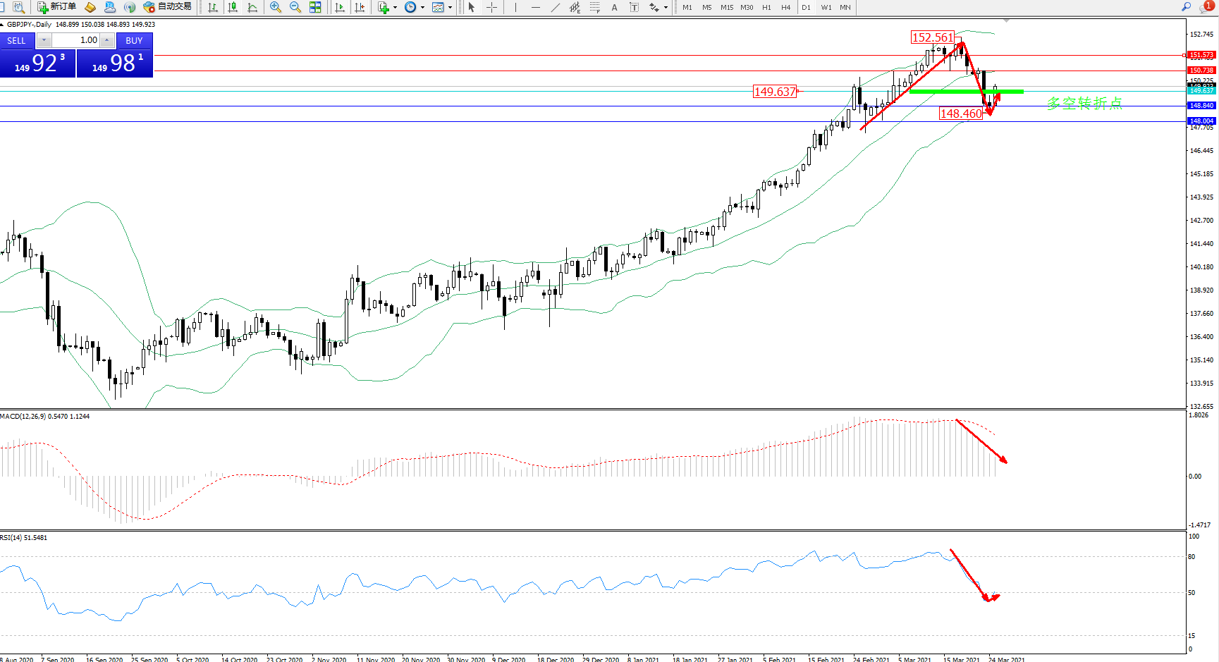技术点评:多头动力延续布林带指标中上轨区间持续震荡上扬,高位抵达152.561附近节点后遇阻开始震荡下行,抵达布林带指标下轨附近148.460位置节点后得到支撑,多头动力反转向上移动,多头动力有进一步回升迹象,布林带指标呈收口走势后开始平移,MACD指标处于多头区域高位持续向下移动中,RSI指标空头动力不断下行,跌破50均衡线后持续震荡;