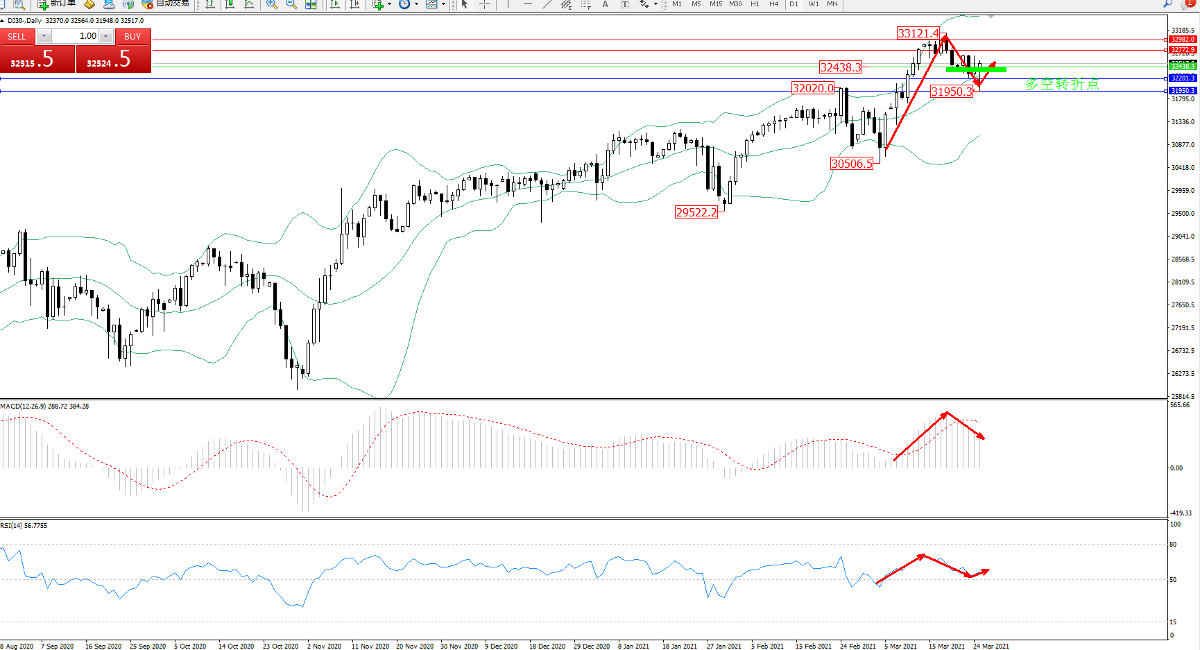 技术点评:多头动力延续布林带指标上轨附近节点持续震荡上扬,高位抵达33121位置后遇阻回撤,跌破中轨抵达31950位置后得到支撑开始反转上移,纠结于中轨上方震荡,布林带指标呈收口走势持续中,MACD指标处于多头区域高位缓慢回撤,RSI指标处于多头区域高位回撤后开始整理平移;
