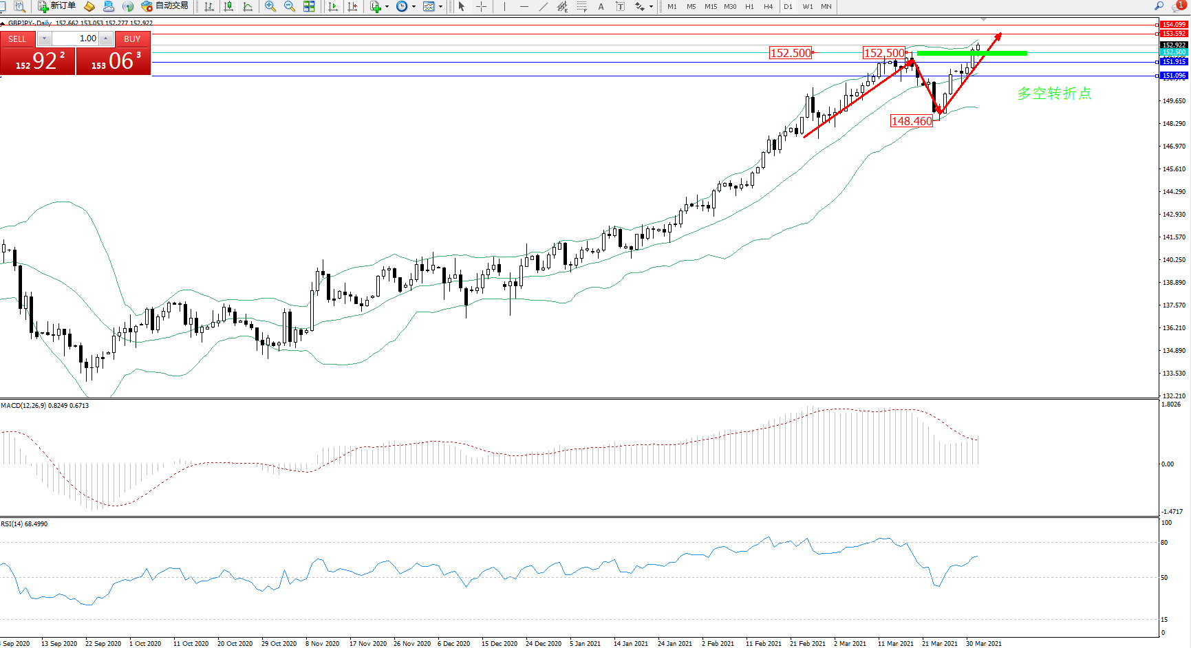 技术点评:多头动力延续布林带指标通道中上轨区间持续震荡上扬,高位抵达152.561位置后遇阻回撤,触及下轨148.460附近节点后多头动力强势反转上移,再度回升至上轨附近持续拉升中,多头动力有继续向上移动态势,布林带指标呈收口走势后开始缓慢平移中,MACD指标处于多头区域高位回撤后开始徘徊,RSI指标处于多头区域高位急速下挫后反转平缓上移;