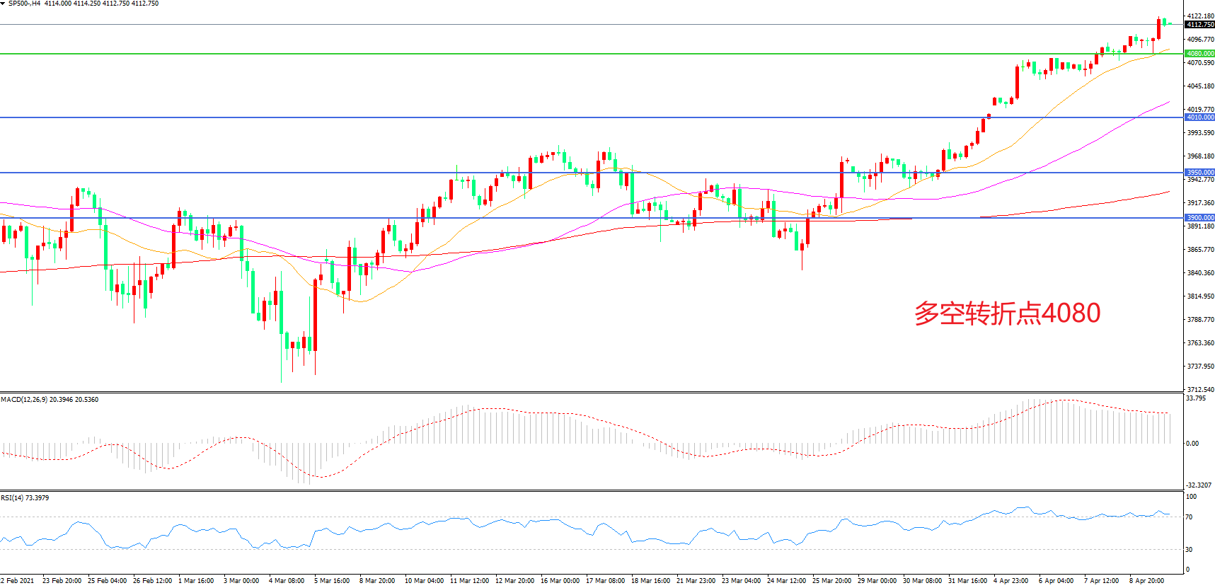 4小时图看,标普500长阳拉升,突破前期整理区间,短期表现偏强,21周期均线成为短期支撑,MACD红柱增加,RSI指标走平,日内延续上行概率较大。