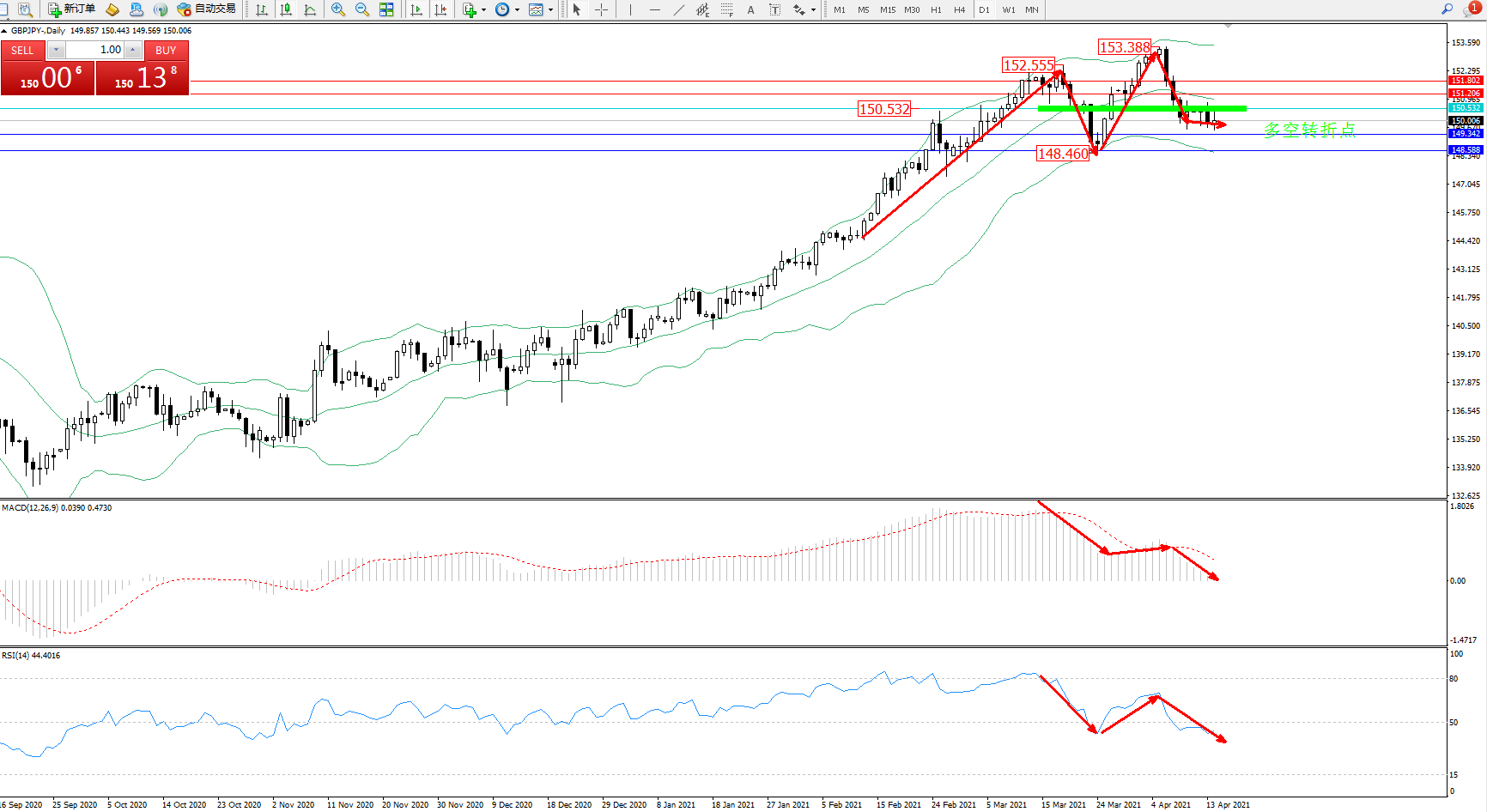 技术点评:多头动力延续布林带指标通道持续震荡上扬,高位抵达153.388位置节点遇阻回撤,急速下挫至中下轨区间震荡下行中,空头动力日渐强劲,布林带指标不断拉升上扬后,高位开始有反转平移走势,MACD指标处于多头区域持续震荡向下移动中,RSI指标高位急速下挫至0轴线下方徘徊;