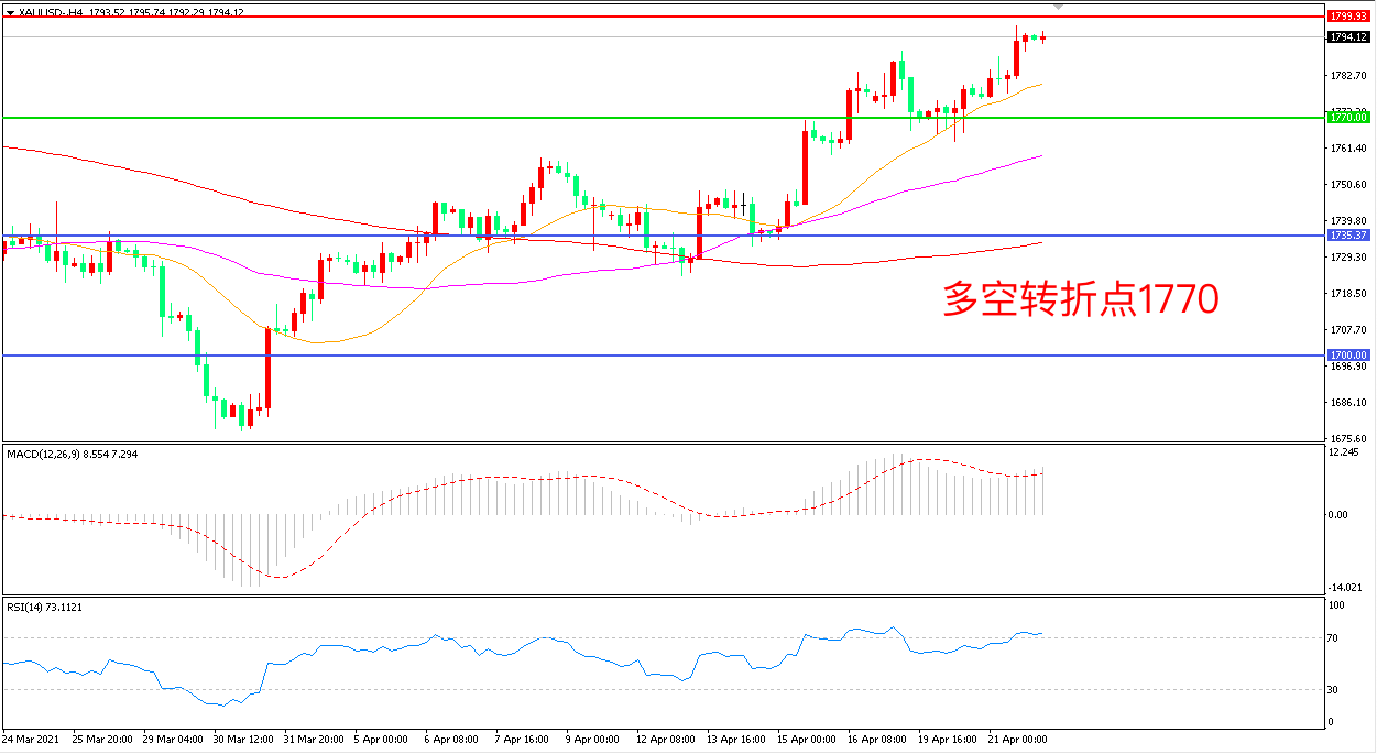 4小时图看,金价回踩21周期均线后大幅拉升,短线表现强势,均线系统呈多头排列,MACD红柱增加,RSI指标走平,1800阻力如能取得突破,有望开启新一波大涨。