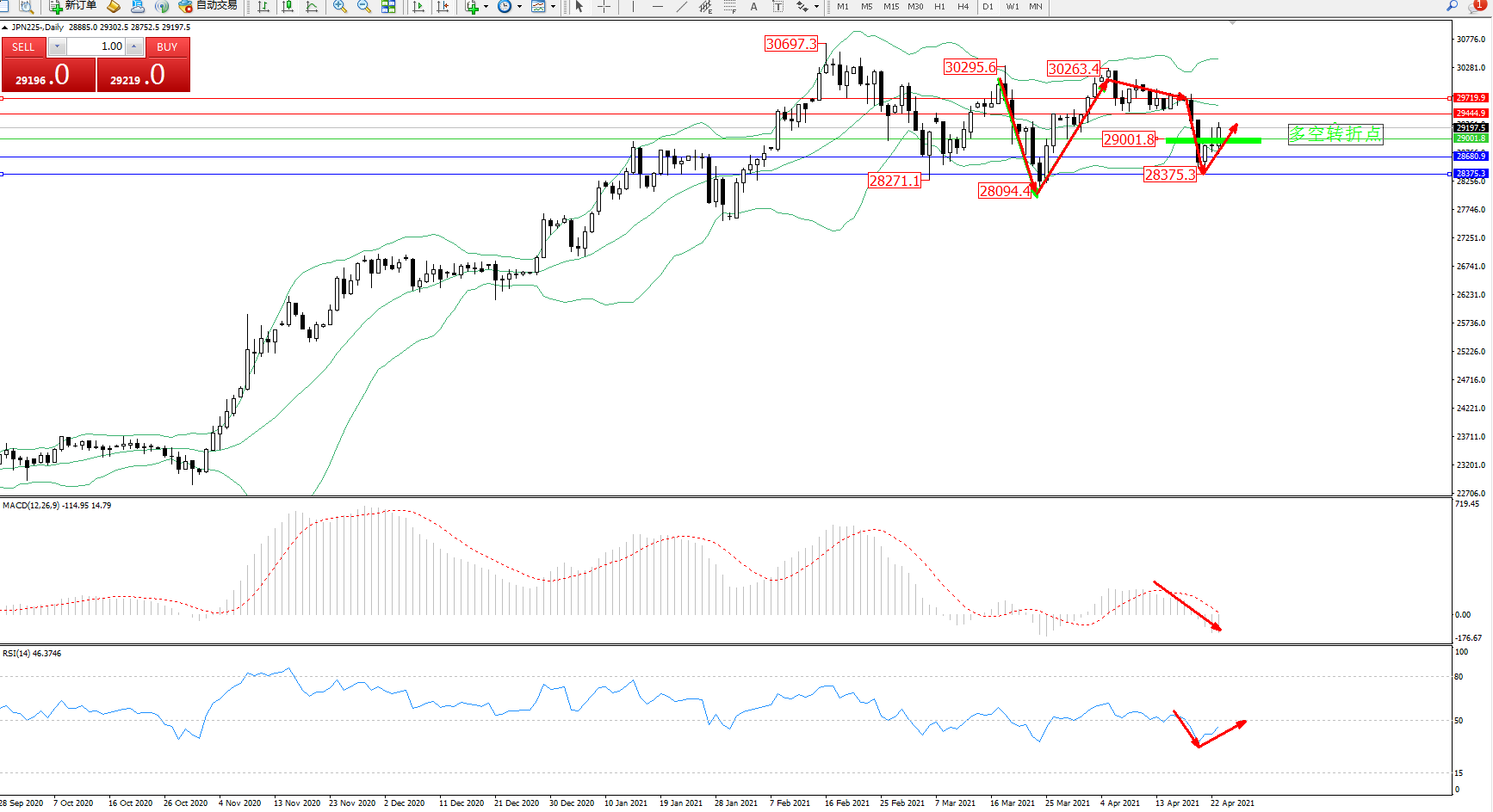 技术点评:长时间维持在布林带指标通道内处于宽幅震荡走势中,空头动力司机入场跌破布林带指标下轨附近节点后不断向下移动中,低位抵达28375附近得到短暂支撑多头伺机入场,反转回升,多头持续上移,布林带指标呈张口走势后开始收口,但仍处于下轨附近弱势震荡中,MACD指标处于0轴线下方维持震荡后开始缓慢下挫,RSI指标空头动力弱势纠结于50均衡线下方空头区域下移后回升;