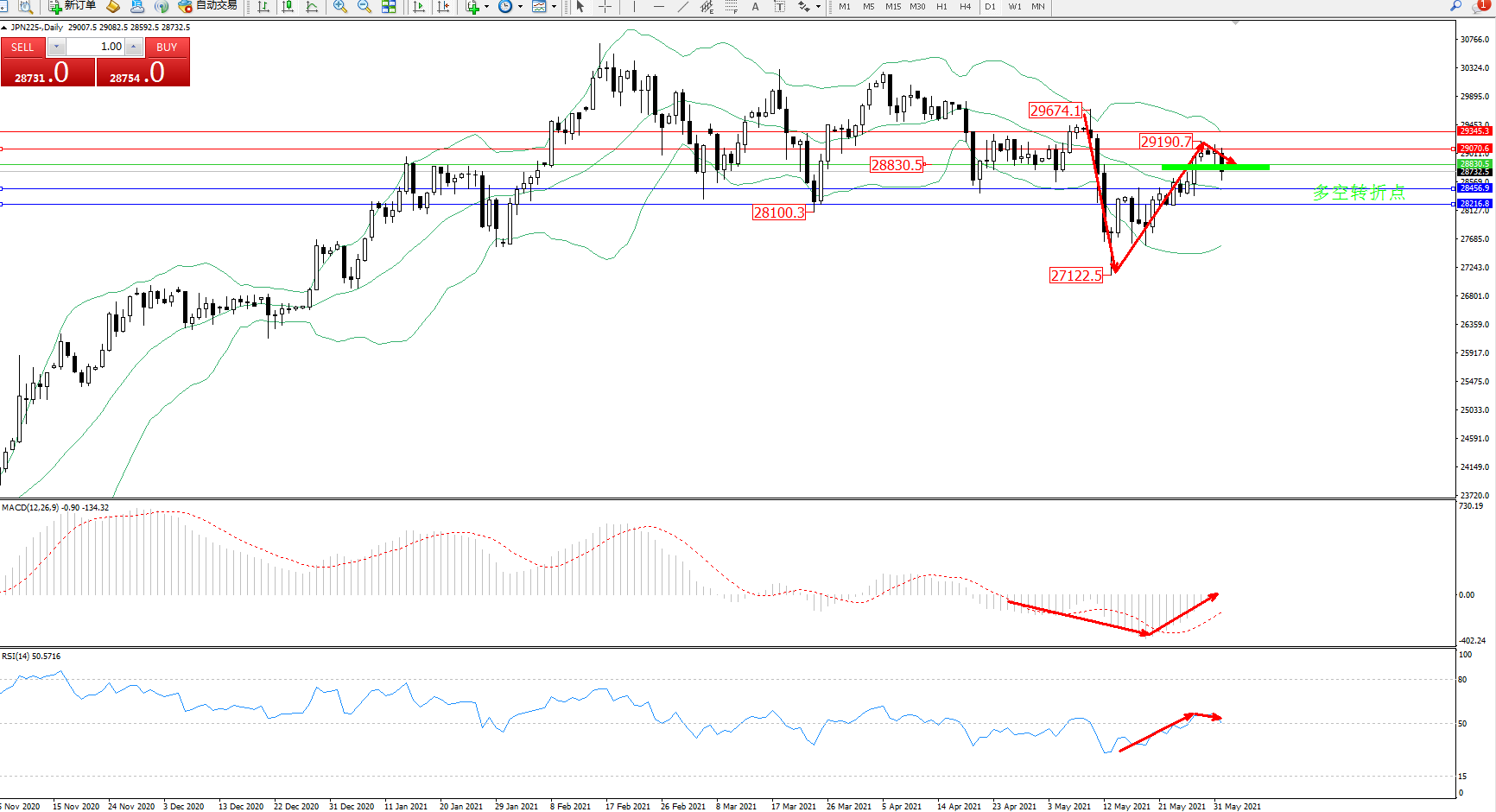 技术点评:空头动力急速下挫后,低位多头反转震荡上扬,抵达29190位置遇阻开始震荡回撤,短期空头动力或将维持回调,布林带指标通道呈向下移动走势持续,且处于收口走势中,MACD指标处于空头区域低位震荡缓慢回升中,RSI指标处于50均衡线上側维持震荡后有向下移动迹象;