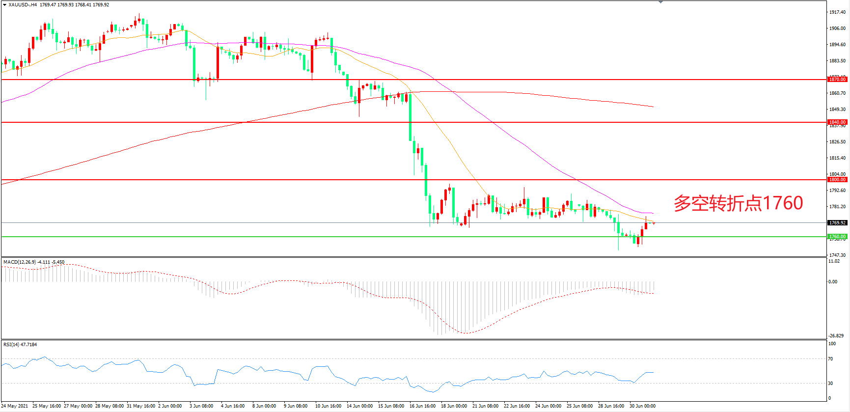 周三(6月30日),“小非农”ADP就业人数变动69.2万人,超市场预期的60万人,美元指数继续走强,美债收益率下行提振金价,现货黄金小幅反弹收报1769.31美元/盎司。如果周五晚间非农数据表现强劲,劳动力市场走强的迹象可能会增添美联储加快加息步伐的压力,并提振美元,而如果数据不及预期,美元将变得脆弱,黄金将迎来新的复苏时机。