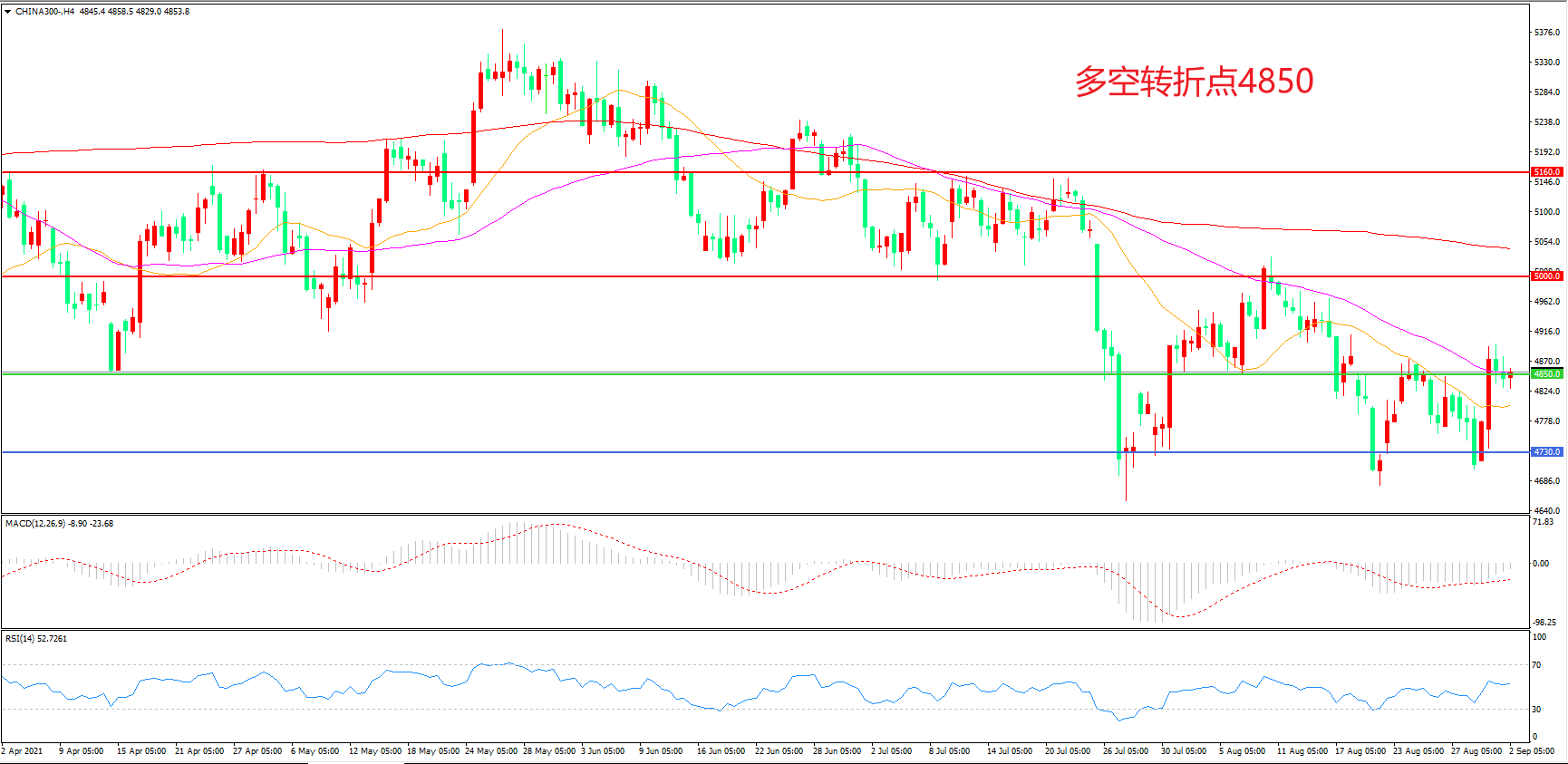 4小时图看,沪深300连续拉升后小幅回调,但上行趋势依然完好,4850成为短期多空分水岭,MACD绿柱缩短,RSI指标走平,日内震荡上行概率较大。