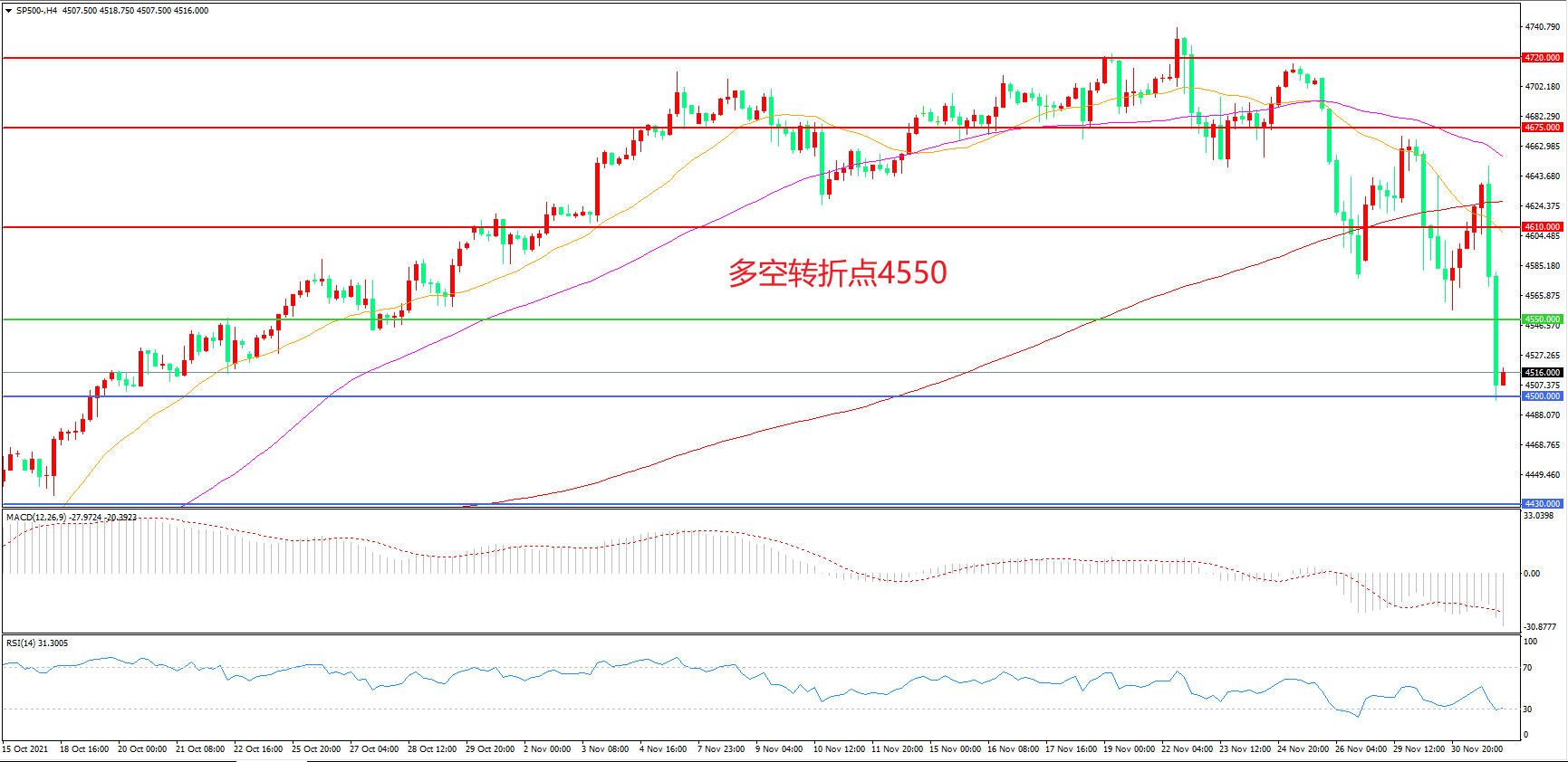 周三(12月1日),美国确认第一例奥密克戎毒株感染病例,且感染者已经完成新冠疫苗接种,美股闻讯大跌,标普500长阴下破,收报4507.50点。如果疫苗对奥密克戎无效,市场将面临另一波全球感染的风险,疫情之外,重点关注本周五非农就业数据的表现。