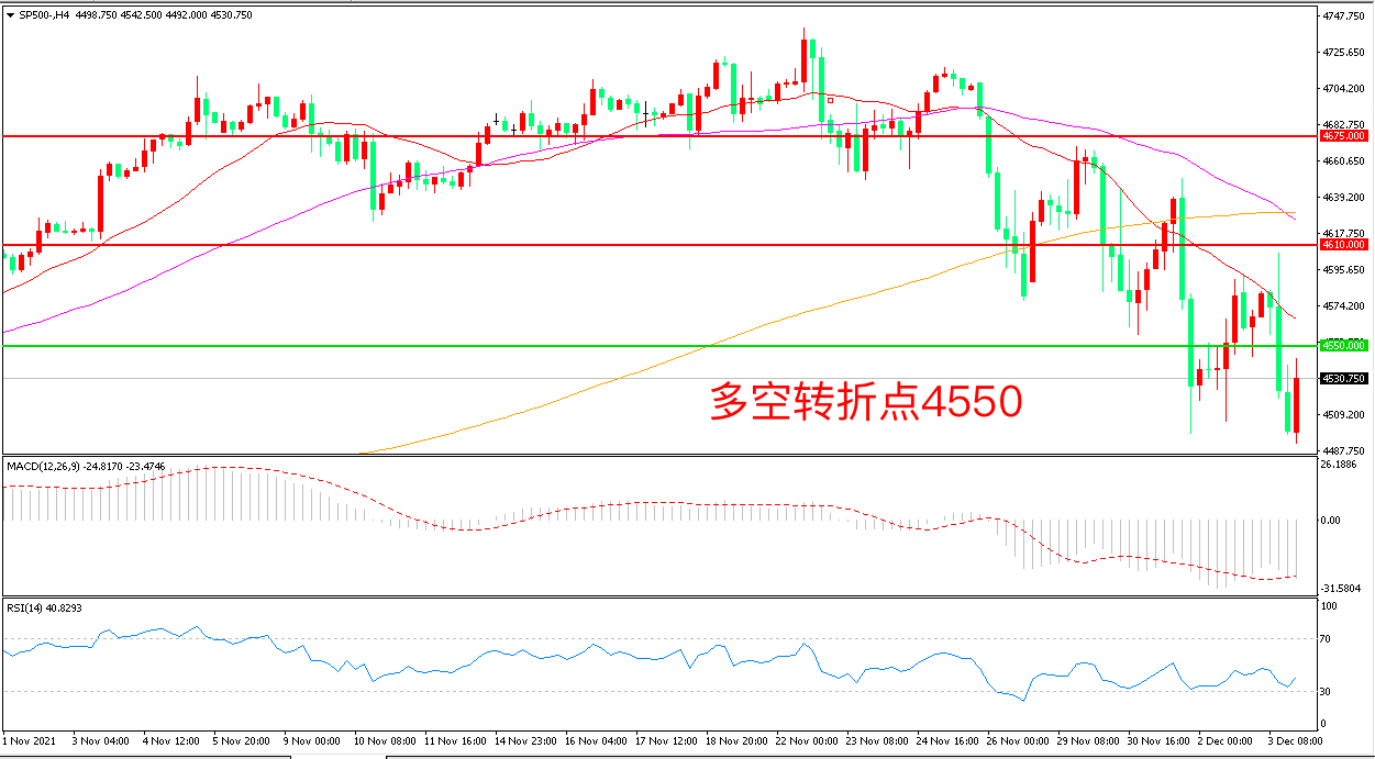 上周五(12月2日),根据美国劳工部的数据显示,美国11月非农就业增幅大幅不及预期,科技股遭遇全线抛售,标普500大幅回调,收报4530.75点。让市场忧心的是,FAAMNG科技股已出现全面下跌,原因包括美联储转鹰、估值高企以及年终波动等多重威胁,如果美联储的鹰派倾向再次向市场施压,美股可能迎来更大幅度的调整。