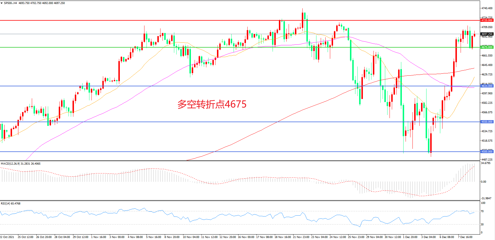 4小时图看,标普500长阳后延续高位震荡,短期走势偏强,均线系统有形成金叉迹象,4675成为多空分水岭,MACD红柱增加,RSI指标走平,日内震荡上行概率较大。