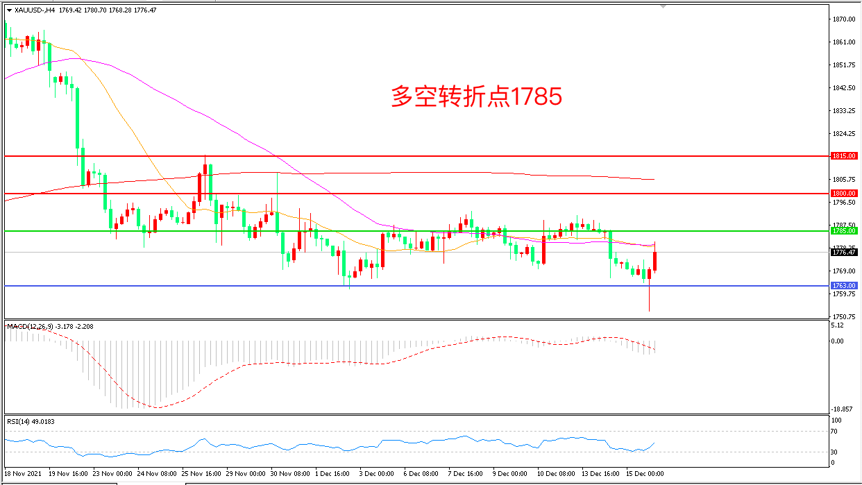 周三(12月15日),美联储决定将减码QE的速度提升一倍,而“点阵图”显示官员们预计明年将加息三次,更为鹰派,现货黄金一度下挫逾10美元,但鲍威尔讲话期间行情开始逆转,最终收报1776.47美元/盎司。短期来看,由于美联储的“鹰派”表现已经被提前定价,“靴子落地“后,持续走高的通胀将再次对金价形成支撑。