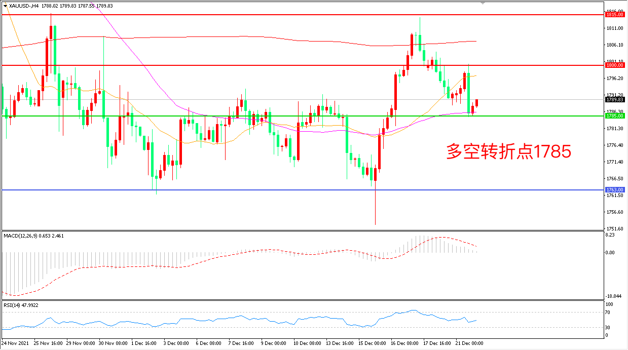 周二(12月21日),美国食品和药物管理局(FDA)计划授权默沙东和辉瑞新冠口服特效药物的使用,避险情绪退潮导致金价冲高回落,收报1788.86美元/盎司。但奥密克戎的快速蔓延依然对市场形成巨大威胁,如果疫情封锁措施重启,也对金融市场造成冲击,多头是否能够收复并收稳于1800美元/盎司之上,是本周黄金能否开启涨势的关键。
