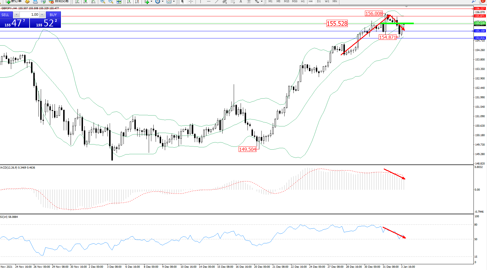 技术点评:多头动力延续布林带指标通道中上轨区间持续震荡上扬,高位抵达156.008位置后遇阻回撤,即将触及布林带指标下轨附近节点,布林带指标呈收口走势中,短期空头动力有继续回调迹象,MACD指标多头区域维持整理回撤下行,RSI指标多头区域持续震荡下行至50均衡线附近震荡中;