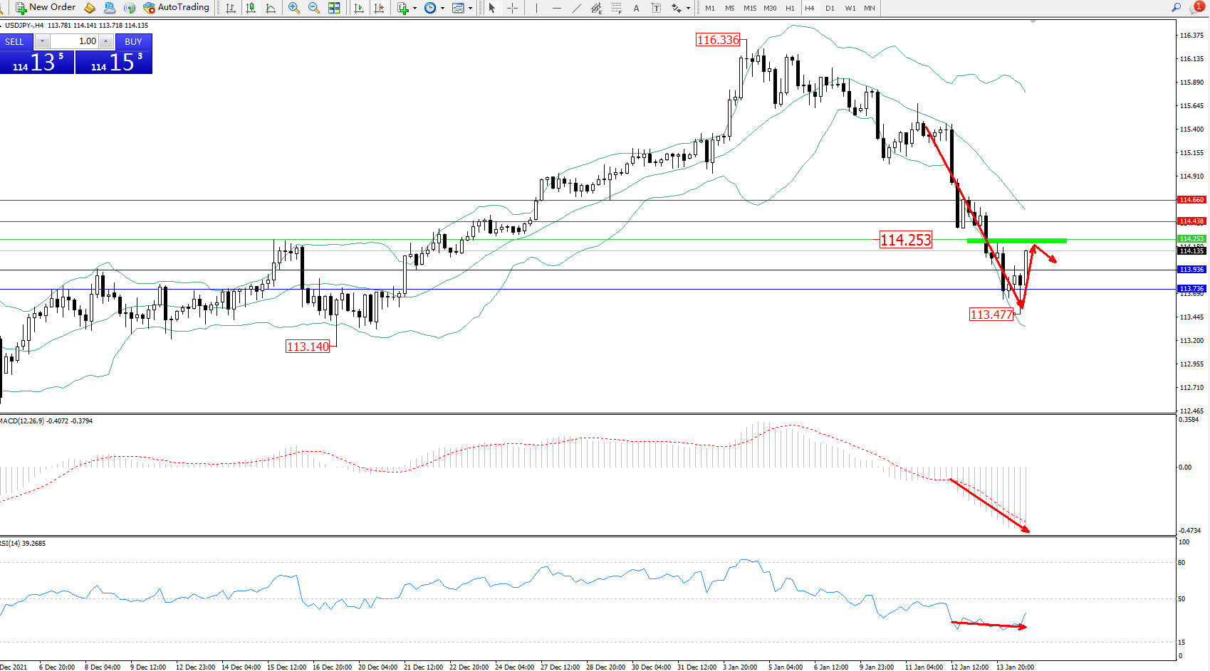 技术点评:高位空头动力维持布林带指标下轨附近持续震荡下行,低位抵达113.477附近节点后得到支撑反转上移,布林带指标呈张口走势持续向下移动,上轨附近有短暂收口迹象,MACD指标处于空头区域维持整理缓慢下行后徘徊,RSI指标处于空头区域维持低位整理中;