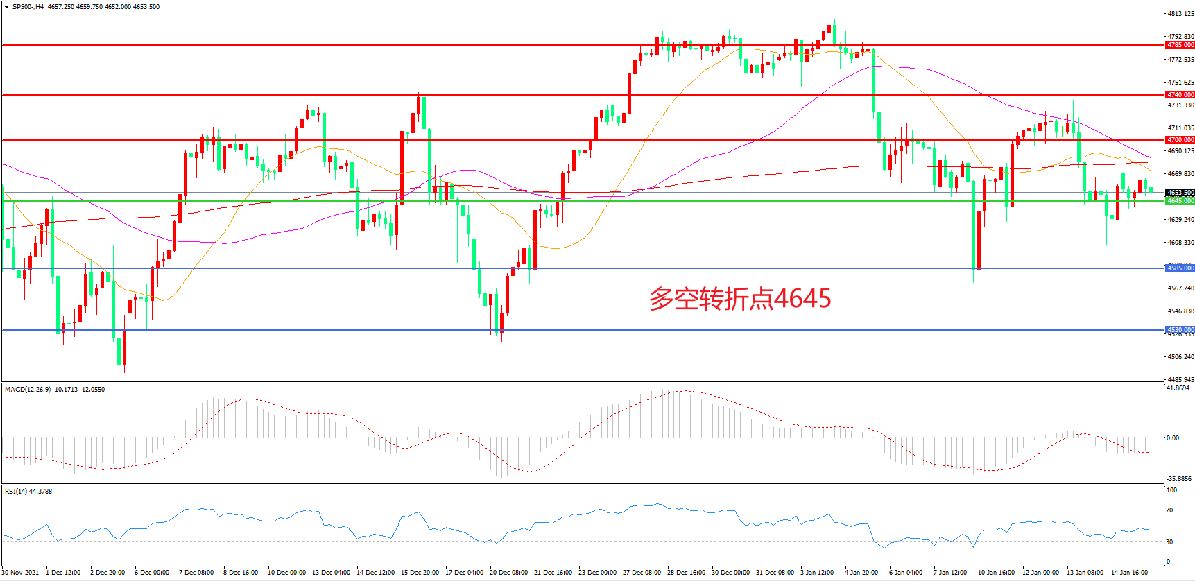 4小时图看,标普500围绕4645附近窄幅震荡,多空博弈较为胶着,均线系统成为上方阻力,MACD绿柱缩短,RSI指标走平,日内延续震荡概率较大。