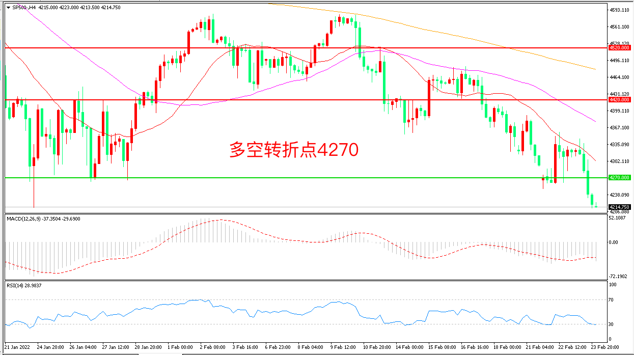 周三(2月23日),俄乌局势继续施压美股,乌克兰进入全国紧急状态,欧盟和美国公布对俄新制裁后,标普500加速下跌,收报4215点。乌克兰外交部长表示,俄罗斯已经准备好进攻,如果乌克兰真的爆发局部战争,避险情绪将再次高涨,对美股为首的风险资产形成明显压力,美股延续下行概率较大。