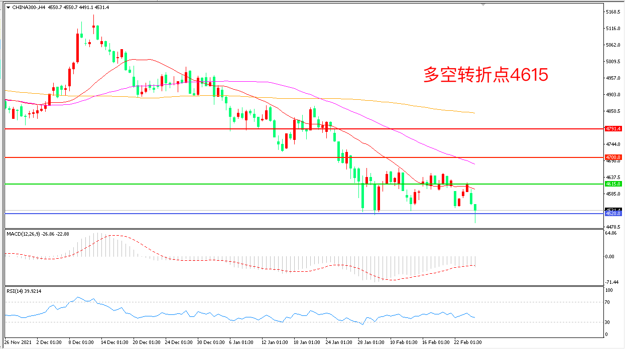 4小时图看,沪深300低开低走,区间震荡迹象明显,4615成为上方阻力,4520成为下方支撑, MACD绿柱增加,RSI指标走平,日内延续震荡概率较大。
