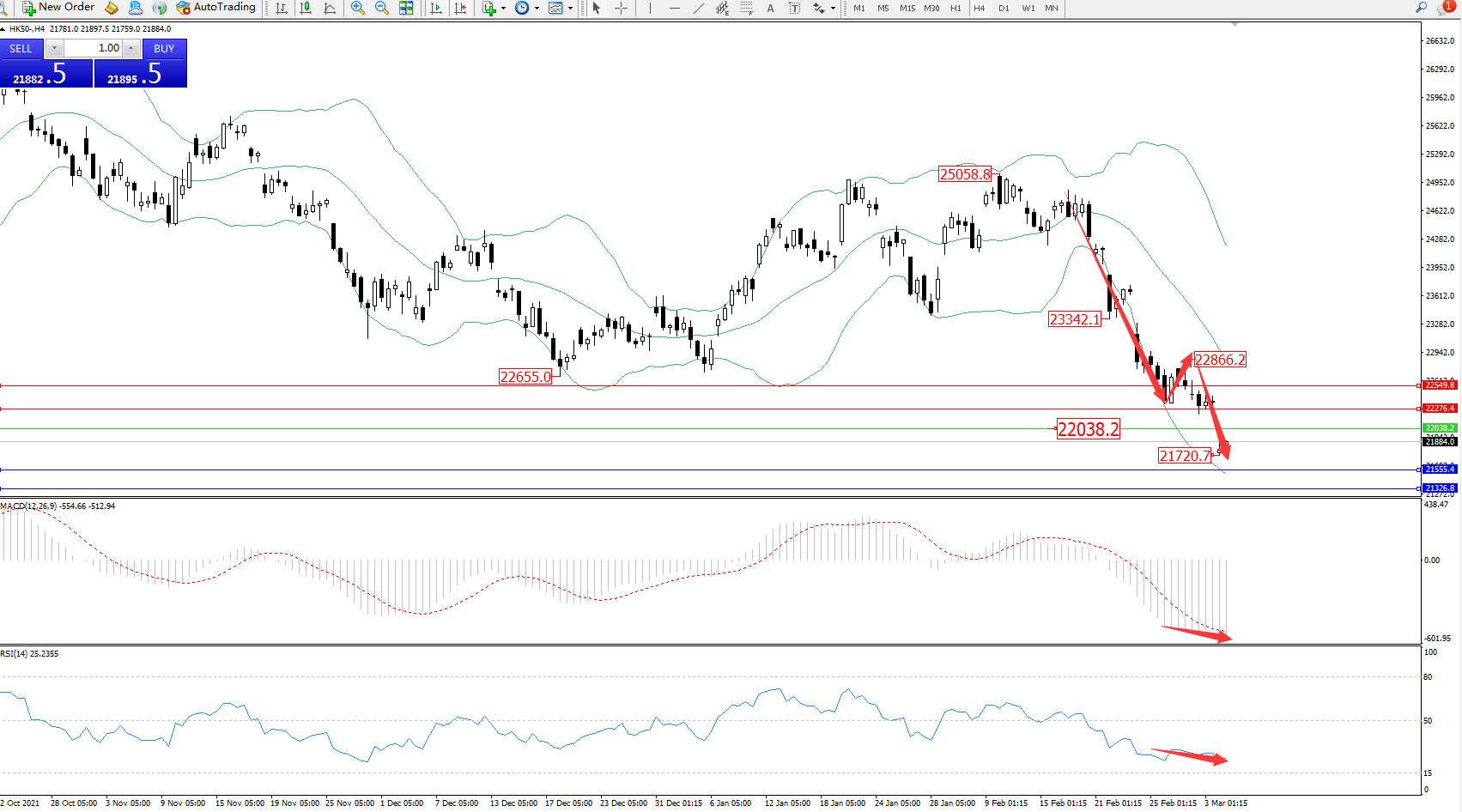 香港恒生指数3月4日(周五)收盘下跌562.05点,跌幅2.5%,报21905.29点;港股大跌,行业板块齐挫,恒生科技指数更是大跌4.43%再创历史新低。大型科技股继续走低拖累大市下挫,京东跌8.32%,百度跌超6%,美团、阿里巴巴、网易、小米跌超5%,腾讯跌近4%;南下资金全天净买入43.03亿港元,为连续第8日净买入;其中,沪港通净买入17.49亿港元,深港通净买入25.54亿港元。香港特区疫情近期明显走高、新增确诊仍在快速上行通道、死亡和重症率偏高。短期而言,疫情升级叠加防控措施加强,都难免对经济活动特别是线下消费造成一定扰动,但据欧美多轮疫情经验看,此种扰动更多为瞬时冲击,待疫情缓解后将逐步修复。近期更多因情绪驱动的抛售,反而有助于市场快速消化其他各种不确定性,达到“情绪底”。因此,虽然仍存在短期扰动,但该行仍然看好港股的中期前景。后续更多稳增长政策出台,不仅将有助于吸引南向资金流入,也会提升整体风险偏好。