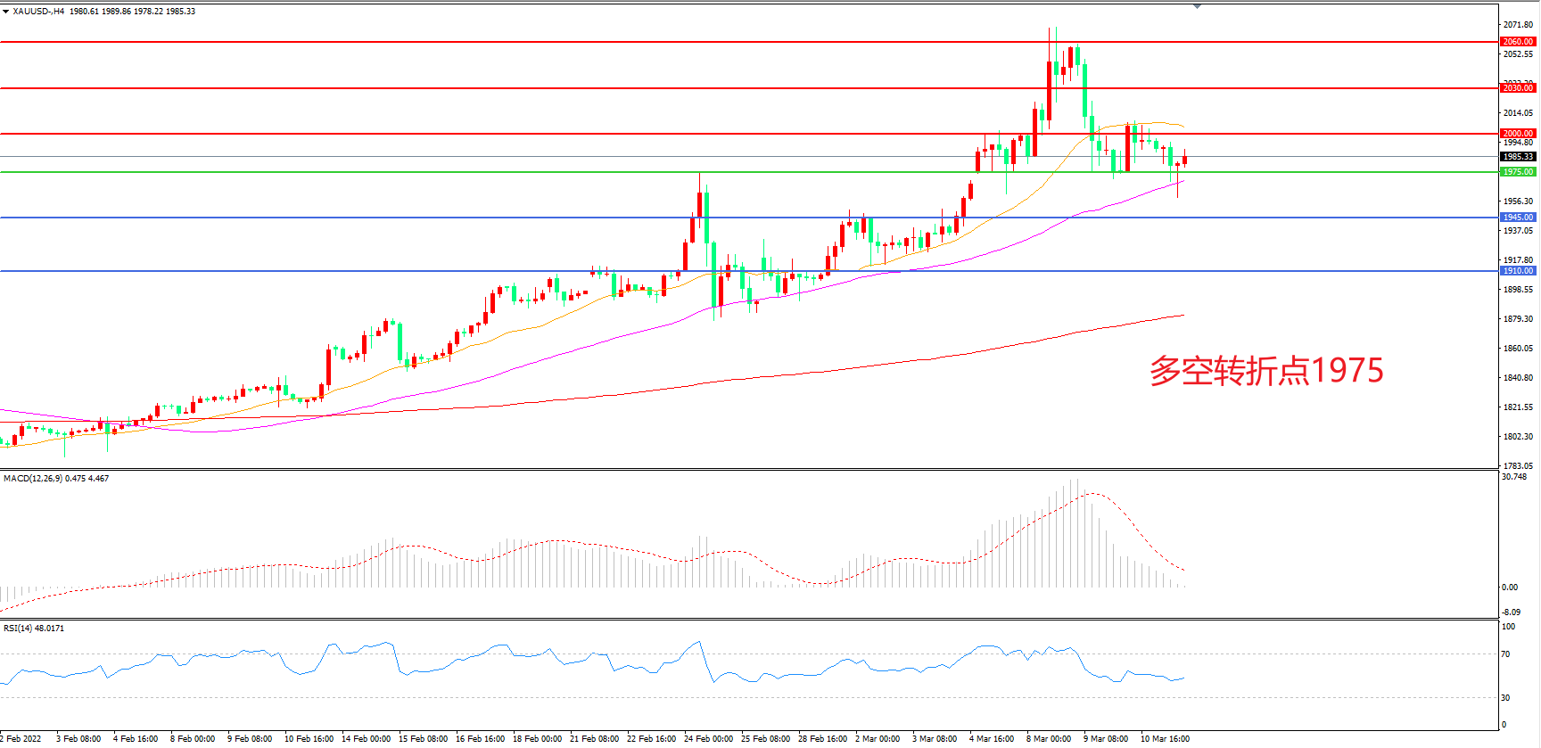 上周五(3月11日),金价在在逼近2075.45美元/盎司纪录高位后下行,回吐周内多数涨势,但俄乌战争已经严重恶化了通胀形势,避险与通胀并存的环境让金价依然保持坚挺,现货黄金窄幅震荡后收报1985.23美元/盎司。目前黄金市场主要交易逻辑由战争驱动,鉴于美俄角力的复杂性,地缘政治风险将对金价持续形成支撑。