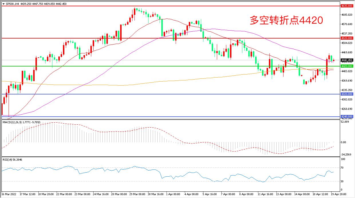4小时图看,标普500长阳拉升后小幅回落,短期走势回暖,55周期均线成为支撑,4420成为多空分水岭,MACD绿柱缩短,RSI指标走平,日内震荡上行概率较大。