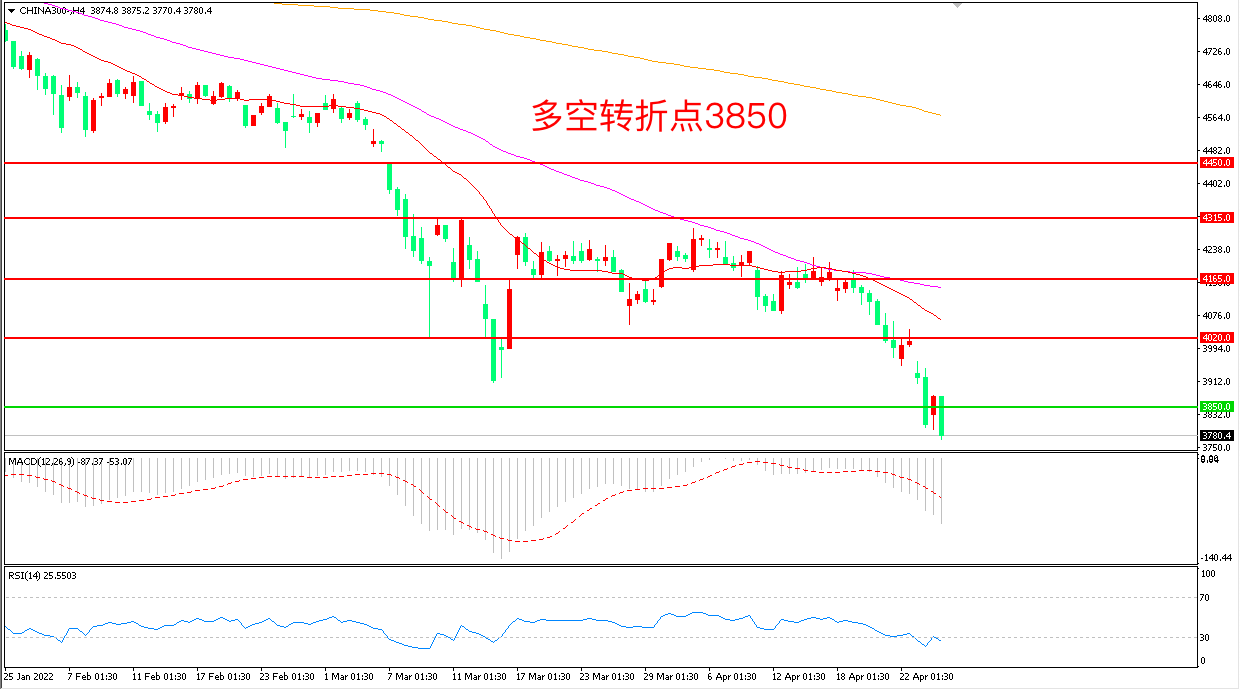 4小时图看,沪深300冲高回落,短线走势疲态尽显, 3850成为多空分水岭,MACD绿柱增加,RSI指标走平,日内震荡下行概率较大。