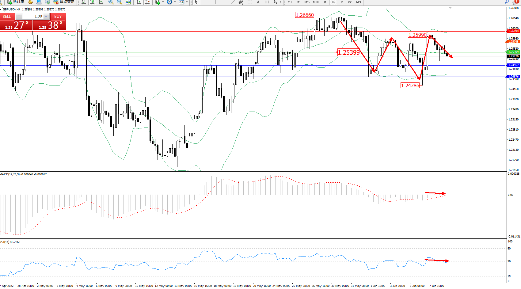 交易策略:1.25399下方看跌,目标1.24957、1.24576